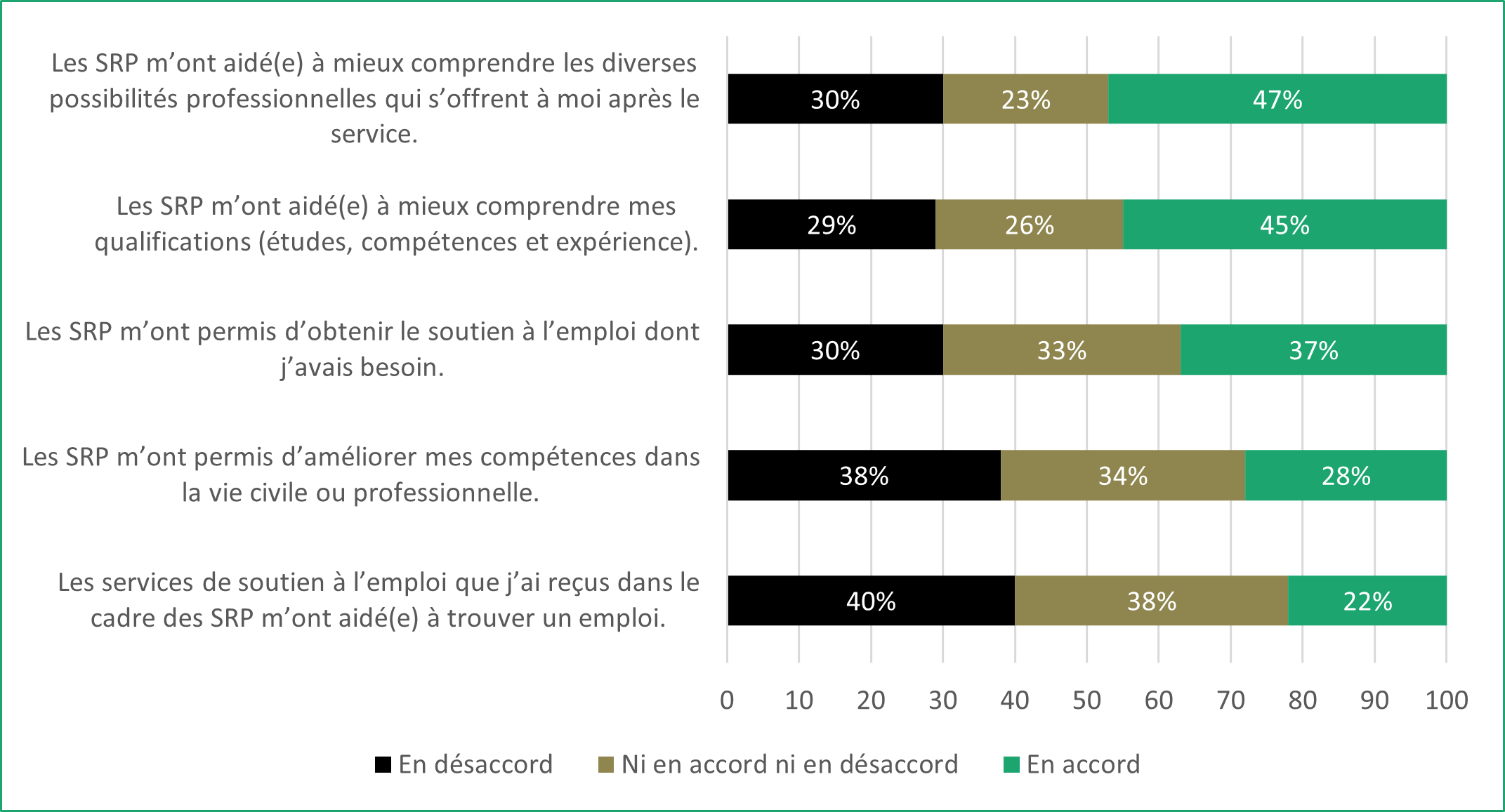 Entre environ le quart et moins de la moitié des vétérans qui ont répondu au sondage ont indiqué que les SRP les ont aidés à trouver un emploi (21,8 %), à améliorer leurs compétences civiles (28 %), à recevoir le soutien à l’emploi dont ils avaient besoin (36,8 %), à mieux comprendre leurs qualifications (44,8 %) et à mieux comprendre leurs possibilités de carrière après le service. Cela peut être une indication que le groupe de clients a des besoins non satisfaits.
