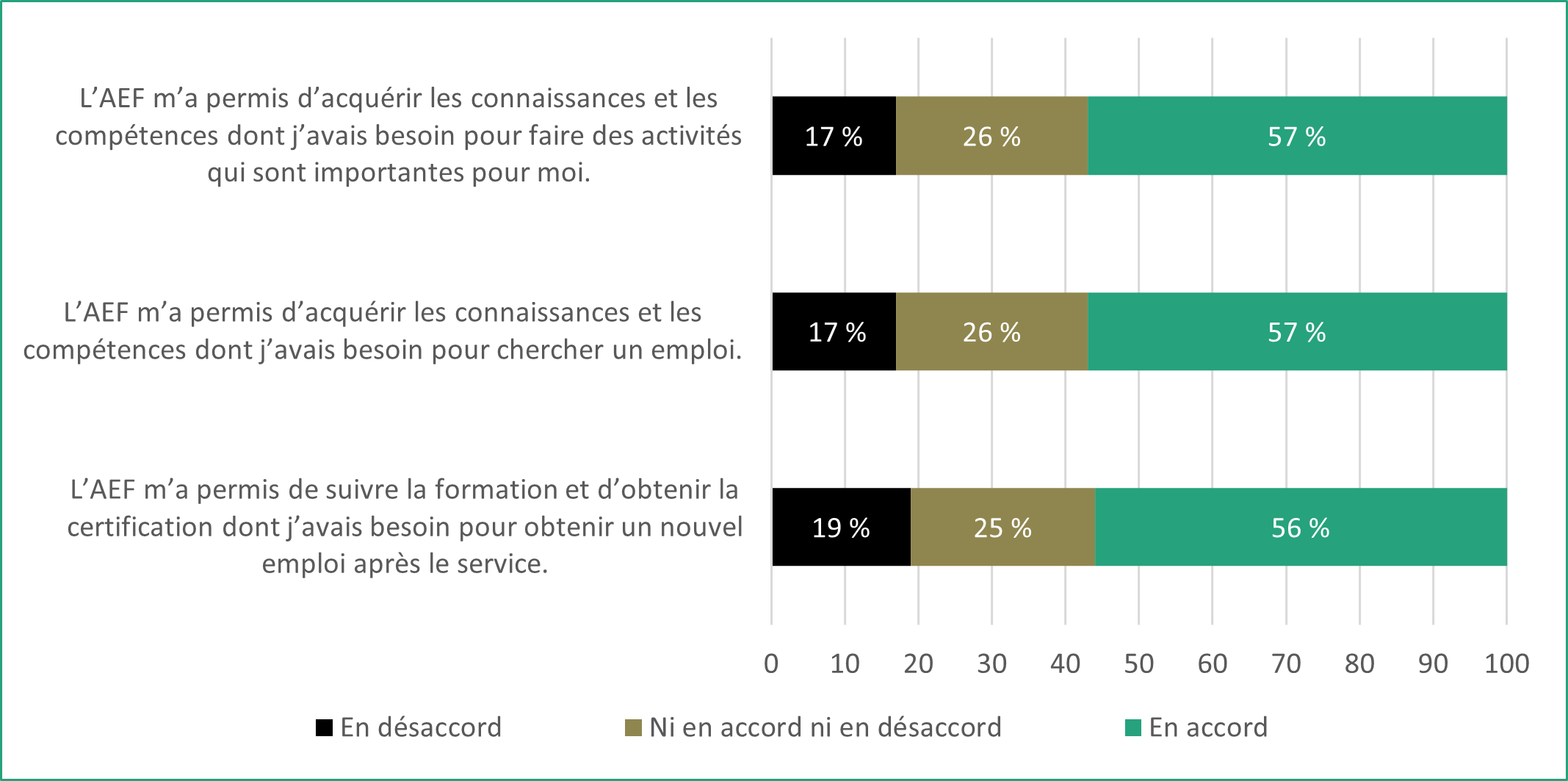 | L'AEF m'a permis d'acquérir les connaissances et les compétences dont j'avais besoin pour chercher un emploi. | 17 % | 26 % | 57 % |