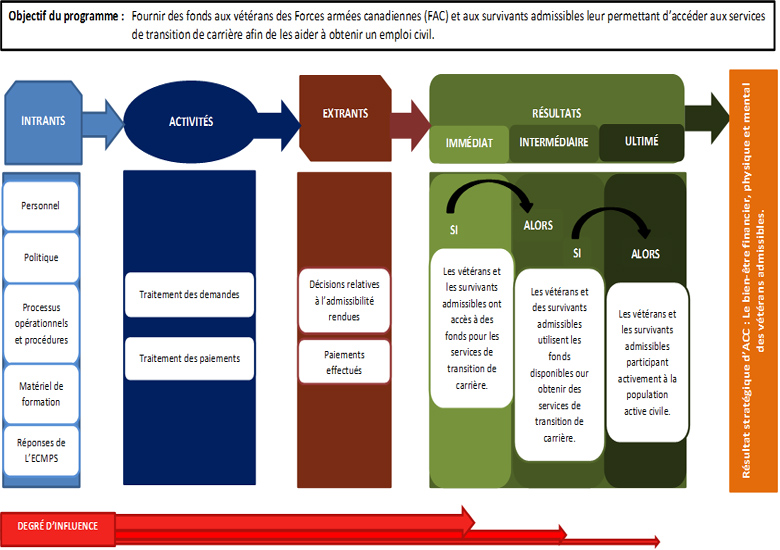 Objectif du programme : Fournir des fonds aux vétérans des Forces armées canadiennes (FAC) et aux survivants admissibles leur permettant d’accéder aux services de transition de carrière afin de les aider à obtenir un emploi civil. Note de bas de page 34