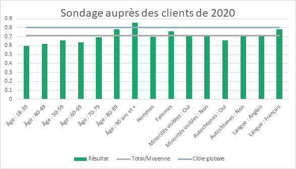 La cible de 80 % a été atteinte seulement pour les vétérans de 90 ans et plus. La satisfaction est plus faible chez les jeunes vétérans des Forces armées canadiennes, avec un taux de satisfaction de 60 % chez les vétérans âgés de 18 à 39 ans. Le taux de satisfaction des vétérans autochtones était de 63 %, ce qui est inférieur au taux de satisfaction de 71 % des vétérans non autochtones. L’équipe d’évaluation reconnaît que le programme a pris des mesures pour accroître l’éventail de programmes et la sensibilisation pour les vétérans de l’ère moderne et les groupes sous-représentés, grâce à une promotion accrue de leurs réalisations et de leurs sacrifices. Toutefois, il reste du travail à faire pour atteindre le niveau de satisfaction cible pour les groupes susmentionnés. Le prochain sondage auprès des clients (prévu pour l’été 2022) présentera d’autres résultats qui aideront à éclairer les décisions ainsi que l’orientation et les modifications à apporter aux programmes futurs.