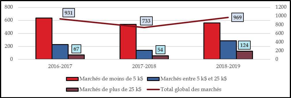 | Marchés de moins de 5 k$ | Marchés entre 5 k$ et 25 k$ | Marchés de plus de 25 k$ | Total global des marchés |