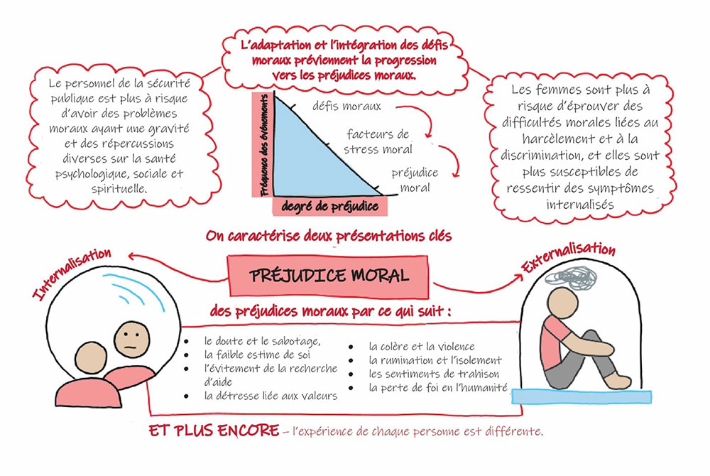 Infographie sur les préjudices moraux. En haut à gauche, une bulle de discours rose indique : « Le personnel de la sécurité publique est plus à risque d’avoir des problèmes moraux ayant une gravité et des répercussions diverses sur la santé psychologique, sociale et spirituelle ». En haut à droite, une bulle rouge se lit comme suit : « Les femmes sont plus à risque d’éprouver des difficultés morales liées au harcèlement et à la discrimination, et elles sont plus susceptibles de ressentir des symptômes internalisés ». Au centre, un triangle bleu à angle droit illustre : « L’adaptation et l’intégration des défis moraux préviennent la progression vers les préjudices moraux ». Sur le côté gauche, on lit « Fréquence des événements », en dessous : « degré de préjudice » et sur l’hypoténuse « défis moraux », « facteurs de stress moral » et « , préjudice moral ». En dessous, on peut lire : « On caractérise deux présentations clés des préjudices moraux par ce qui suit : » avec deux chiffres, l’un étiqueté « Internalisation » avec le texte : « le doute et le sabotage, la faible estime de soi, l’évitement de la recherche d’aide, la détresse liée aux valeurs », et l’autre intitulé : « externalisation » avec le texte : « la colère et la violence, la rumination et l’isolement, les sentiments de trahison, la perte de foi en l’humanité ». Une note au bas de la page se lit comme suit : « et plus encore – l’expérience de chaque personne est différente ».