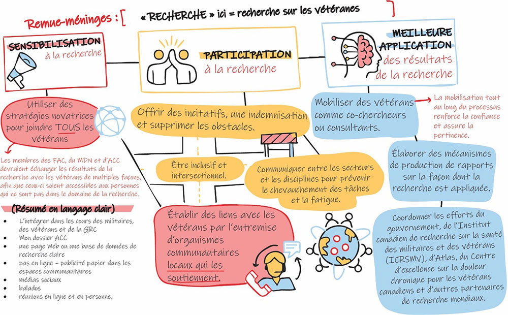 Infographie intitulée « Remue-méninges : [« RECHERCHE » ici = recherche sur les vétéranes] » avec un organigramme. Dans le coin supérieur gauche, un mégaphone rouge est accompagné du texte : « Sensibilisation à la recherche, ». Pour atteindre cet objectif, ACC devrait « Utiliser des stratégies novatrices pour joindre TOUS les vétérans, les membres des FAC, du MDN et d’ACC devraient échanger les résultats de la recherche avec les vétérans de multiples façons, afin que ce soit accessible aux personnes qui ne sont pas dans le domaine de la recherche ». Ensuite, sous « Résumé en langage clair », on lit : L’intégrer dans les cours des militaires, des vétérans et de la GRC, Mon dossier ACC, une page Web ou une base de données de recherche claire, pas en ligne – publicité papier dans les espaces communautaires, médias sociaux, balados, réunions en ligne et en personne ». Au centre, un encadré jaune indique : « Participation à la recherche », « Offrir des incitatifs, une indemnisation et supprimer les obstacles », « Être inclusif et intersectionnel » et « Communiquer entre les secteurs et les disciplines pour prévenir le dédoublement et la fatigue », dans un encadré jaune individuel. Sous le centre, un encadré rouge indique « Établir des liens avec les vétérans par l’entremise d’organismes communautaires locaux qui les soutiennent », et une personne parle. À droite, un cerveau bleu indique : « Meilleure application des résultats de la recherche » avec « : Mobiliser des vétérans comme co-chercheurs ou consultants » et « La mobilisation tout au long du processus renforce la confiance et assure la pertinence ». Dans le coin inférieur droit, un encadré de texte bleu indique : « Élaborer des mécanismes de production de rapports sur la façon dont la recherche est appliquée ». Un autre encadré en dessous indique : « Coordonner les efforts du gouvernement, de l’Institut canadien de recherche sur la santé des militaires et des vétérans (ICRSMV), d’Atlas, du Centre d’excellence sur la douleur chronique pour les vétérans canadiens et d’autres partenaires de recherche mondiaux ».