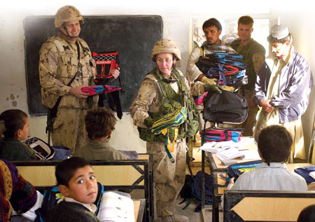 Des membres des Forces canadiennes distribuent des fournitures scolaires à des écoliers en Afghanistan.