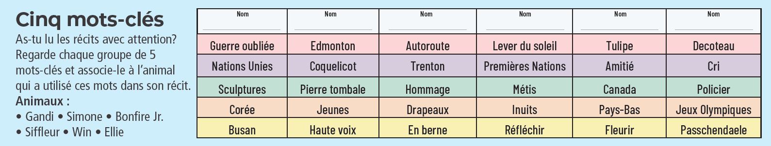 As-tu lu les récits avec attention? Regarde chaque groupe de 5 mots-clés et associe-le à l’animal qui a utilisé ces mots dans son récit.