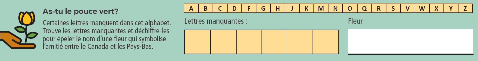 Certaines lettres manquent dans cet alphabet. Trouve les lettres manquantes et déchiffre-les pour épeler le nom d’une fleur qui symbolise l’amitié entre le Canada et les Pays-Bas.