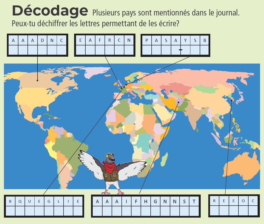 Plusieurs pays sont mentionnés dans le journal. Peux-tu déchiffrer les lettres permettant de les écrire?