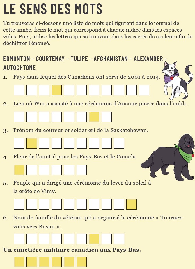 Tu trouveras ci-dessous une liste de mots qui figurent dans le journal de cette année. Écris le mot qui correspond à chaque indice dans les espaces vides. Puis, utilise les lettres qui se trouvent dans les carrés de couleur afin de déchiffrer l’énoncé.