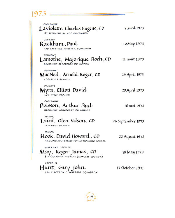 | 80002999 | Laird | Glen Nelson | 26 septembre 1973 | Major | Infantry Branch |
