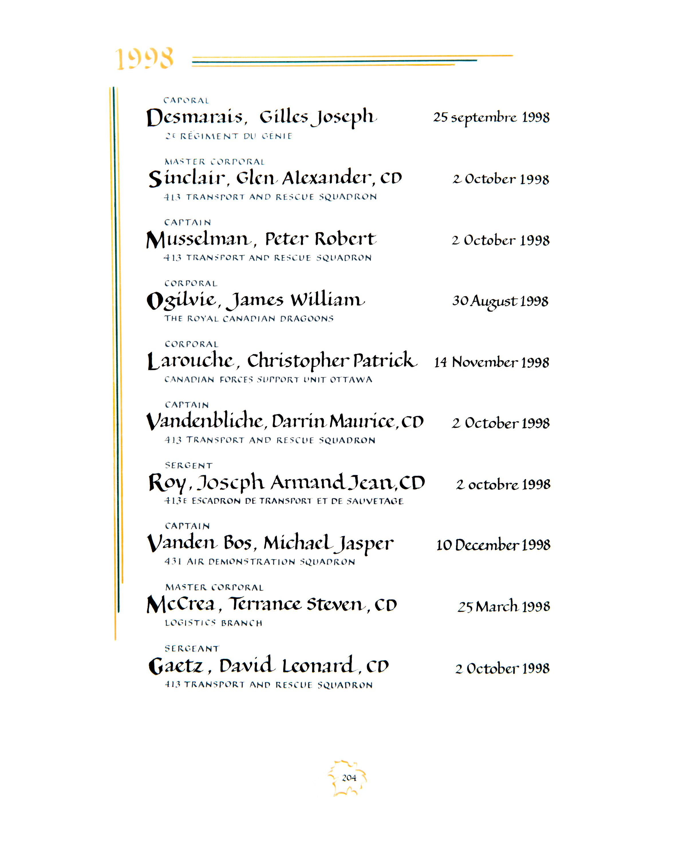 | 80002403 | Musselman | Peter Robert | 2 octobre 1998 | Capitaine | Le 413e Escadron de transport et de sauvetage |