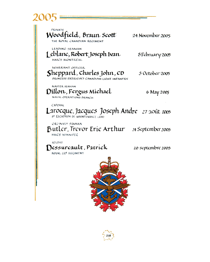 | 80003426 | LeBlanc | Robert Joseph Ivan | 8 février 2005 | Leading Seaman | HMCS Montreal |