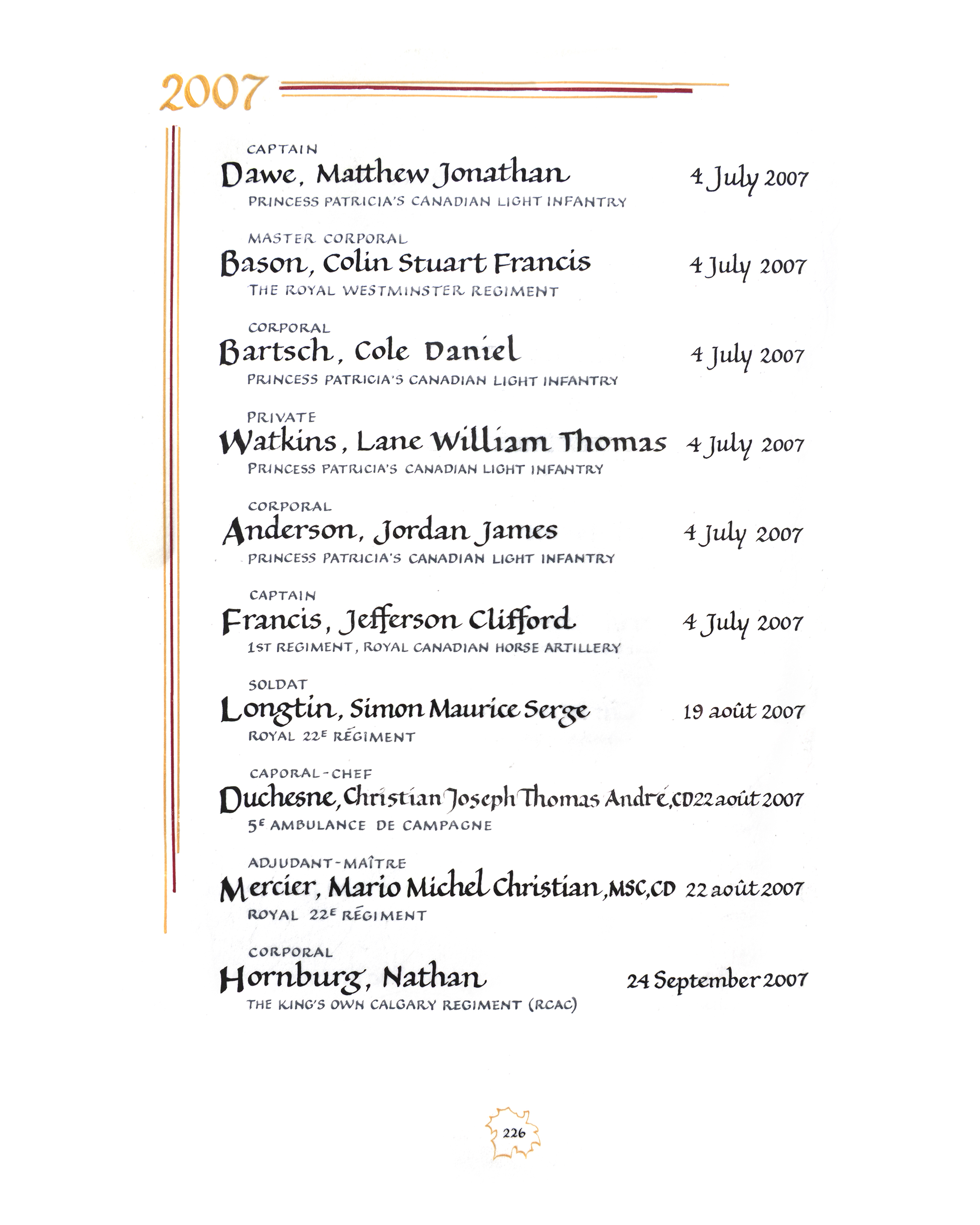 | 80003391 | Dawe | Matthew Jonathan | 4 juillet 2007 | Capitaine | Princess Patricia's Canadian Light Infantry |