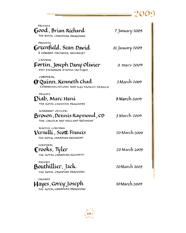| 80003503 | Hayes | Corey Joseph | 20 mars 2009 | Soldat | The Royal Canadian Dragoons |