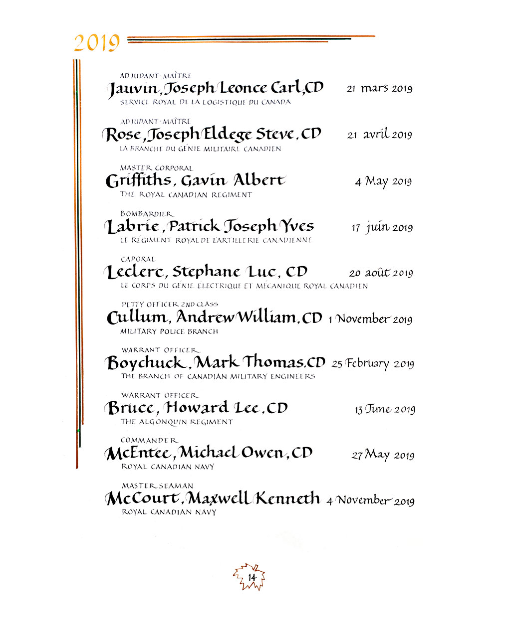 | 80004393 | Bruce | Howard Lee | 13 juin 2019 | Adjudant | The Algonquin Regiment |