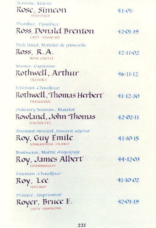 | 2640717 | Roy | Guy Émile | 15 octobre 1941 | Assistant Steward | Vancouver Island |