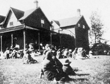 Des Canadiens autochtones firent don d'au moins 44 000 $ pour le secours de guerre et mirent sur pied de nombreux groupes humanitaires, comme cette filiale de la Croix-Rouge, qui se réunissaient dans la collectivité autochtone de Five Hills à Belcarres, en Saskatchewan, en 1915. (R.L. Borden / Bibliothèque et Archives Canada / C-33257)