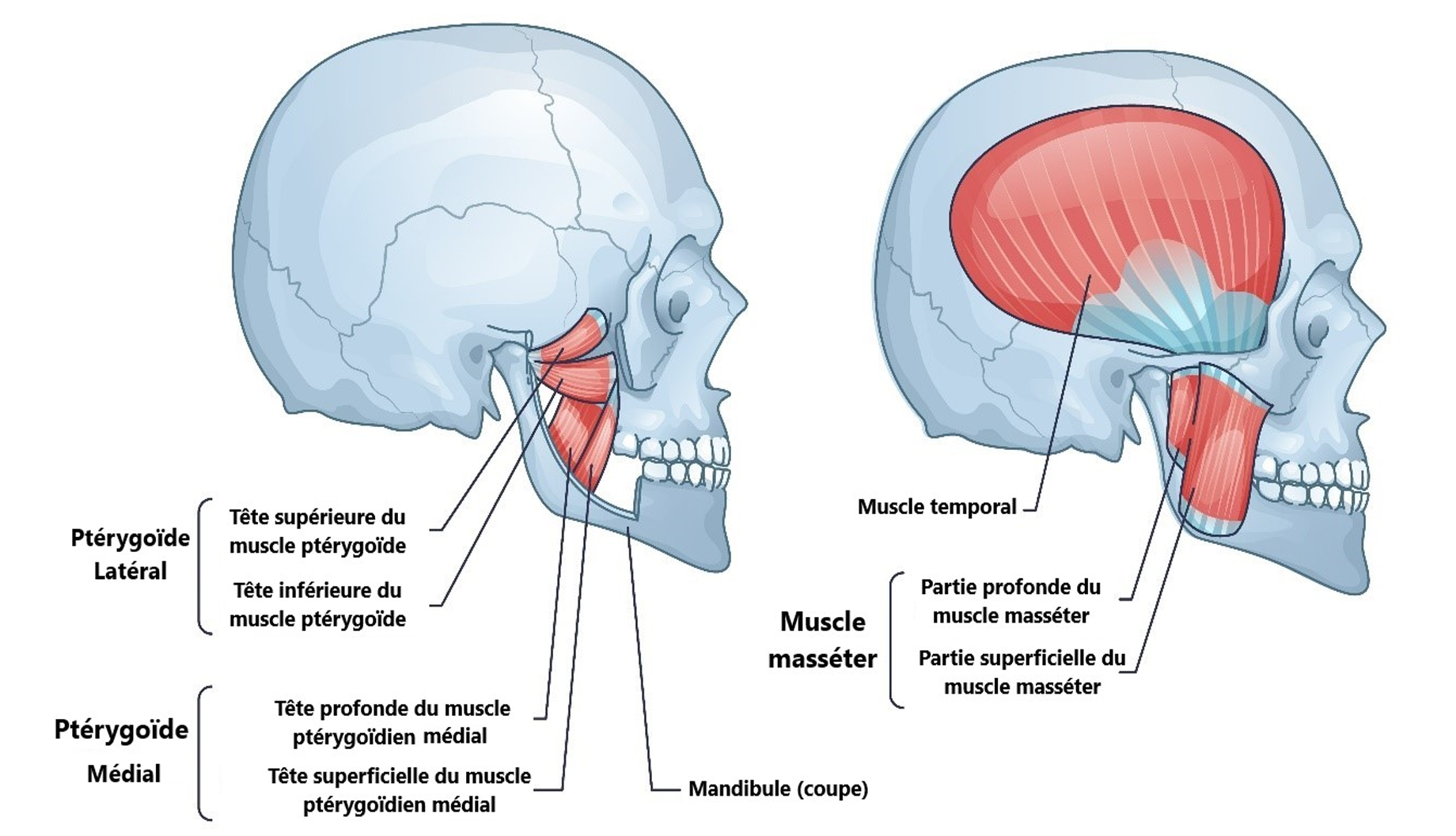 Le mouvement de la mandibule est produit par les muscles masticateurs. Il s’agit de quatre muscles bilatéraux attachés à la mandibule de chaque côté du crâne (Figure 2 : Muscles masticateurs) :