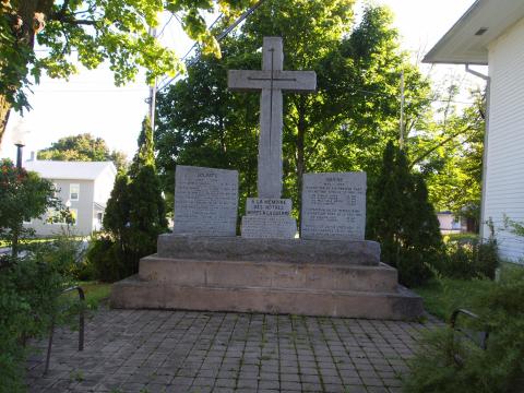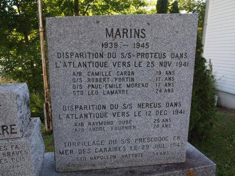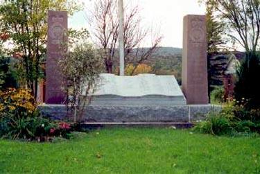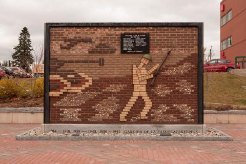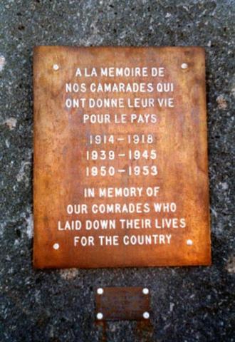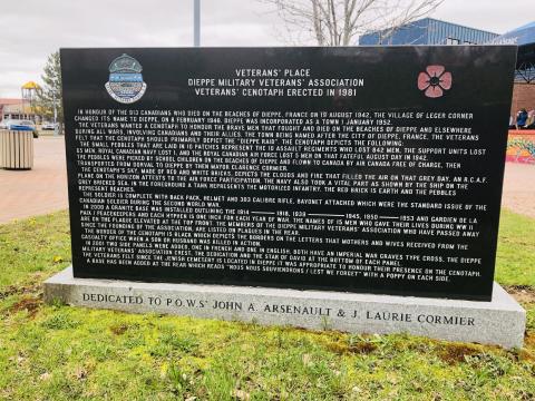 IN 2000 A GRANITE BASE WAS INSTALLED OUTLINING THE 1914----1918, 1939-------1945, 1950----1953 AND GARDIEN DE LA PAIX / PEACEKEEPERS AND EACH HYPHEN IS ONE INCH FOR EACH YEAR OF WAR. THE NAMES OF 13 MEN WHO GAVE THEIR LIVES DURING WWII ARE ON THE PLAQUE ELEVATED AT THE TOP FRONT. THE MEMBERS OF DIEPPE MILITARY VETERANS' ASSOCIATION WHO HAVE PASSED AWAY SINCE THE FOUNDING OF THE ASSOCIATION, ARE LISTED ON PLAQUES IN THE REAR.