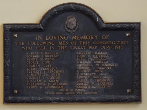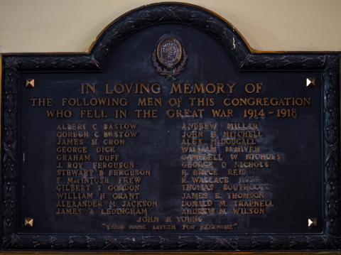 Cette plaque commémore ceux qui étaient membres de la congrégation et qui ont fait le sacrifice suprême pendant la Seconde Guerre mondiale. On y voit l’insigne de l’Église presbytérienne, le buisson ardentf, dans l’aspect supérieur de la plaque.