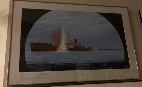 Cette peinture réalisée en 2003 par Joe Dwyer a été offerte par le Cambridge Newfoundland Club. Elle montre l’explosion d’une torpille allemande qui a frappé le côté du SS Saganaga, le 5 septembre 1942. Le SS Lord Strathcona est ancré à l’arrière-plan.