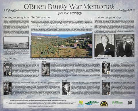 Margaret O’Brien commission la grotte familiale du parc commémoratif de la guerre après avoir perdu quatre de ses six fils en l’espace de deux ans pendant la Seconde Guerre mondiale. Une plaque installée près du chemin Signal Hill à St. John’s la reconnaît comme la « mère la plus endeuillée de Terre-Neuve-et-Labrador pendant la Seconde Guerre mondiale ». Son mari Maurice est décédé en 1942, après avoir perdu leur troisième fils.