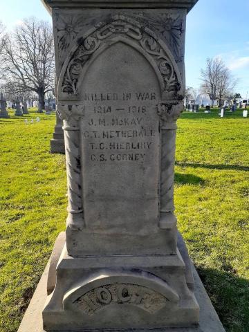 Érigé par l’Ordre impérial des Odd Fellows, ce mémorial est dédié à quatre hommes de la région tués pendant la Première Guerre mondiale. Les Odd Fellows ont commencé à recueillir des fonds pour placer un monument sur leur lot de cimetière en 1887. Le monument a été construit par le tailleur de pierre Joseph Cox en 1889.