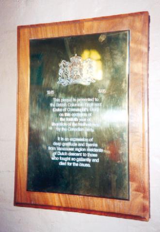 Ce mémorial est dédié aux membres du B.C. Regiment qui ont aidé à libérer la Hollande pendant la campagne de 1944-1945. Ce témoignage de reconnaissance a été présenté par les Canado-Néerlandais de Vancouver en 1970. La plaque mesure 19 pouces sur 12.