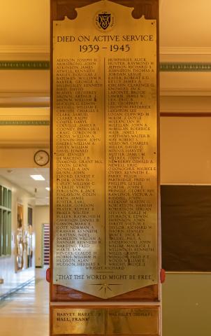 This brass shield bares the names of the 121 Victoria High School alumni who died in the Second World War.