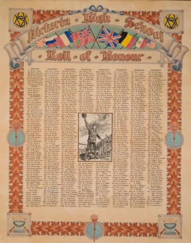 The graduating classes of 1916-17 and 1917-18 created this Honour Roll by handwriting the names of every soldier from Victoria High School who fought in the Great War. They were assisted by J.S. McMillan with the design and execution. Included are the names of 499 soldiers, teachers, students and nurses with a red diamond beside the names of the fallen. Each name represents a person who was in this high school and walked the same halls that students, administrators and guests now walk.