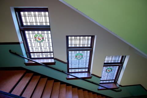 Il y a six vitraux dans l’auditorium, trois de chaque côté. Ce sont toutes des conceptions du logo de l’école. Chaque cage d’escalier hors sol dans le bâtiment de 1914 a trois fenêtres qui montent le mur à côté de l’escalier. Il y a deux cages d’escalier à chaque étage du bâtiment — une dans l’aile qui était réservée aux filles (est) et une dans l’aile qui était réservée aux garçons (ouest). Ces désignations ne sont plus suivies depuis des décennies, mais restent à l’extérieur du bâtiment rénové comme référence historique. Il y a trois niveaux d’escalier qui montent de chaque côté du bâtiment, du premier au quatrième étage. Les 18 fenêtres dans les cages d’escalier alternent entre les deux conceptions.