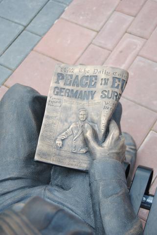 Il est à noter que le journal dans la main du Marin accompli est la première page du Daily Colonist, montrant une image du roi George. Nathan a utilisé les titres des journaux de l’édition spéciale du jour de la Victoire en Europe comme source principale.