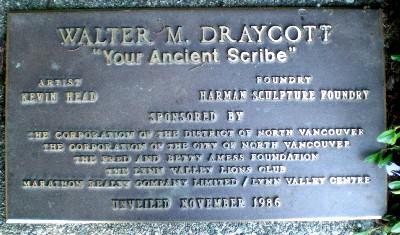 La statue Your Ancient Scribe est une représentation réaliste de Walter Mackay Draycott. Elle a été créée par Kevin Head pendant son apprentissage auprès du sculpteur de renom et spécialiste de la fonderie Jack Harman, qui vivait à Lynn Valley à l’époque. L’œuvre a été créée à la fonderie de Jack Harman, rue Alexandra à Gastown, et dévoilée en novembre 1986.