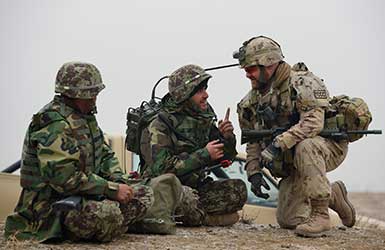 Officiers des Forces armées canadiennes collaborant avec des soldats afghans lors d'un exercice en décembre 2012.