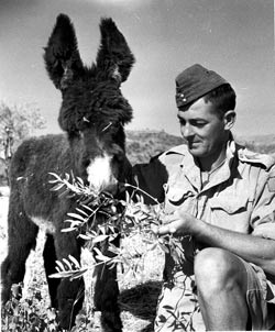 Le Soldat P. T. Leachman avec l’âne mascotte du Saskatoon Light Infantry, en Sicile, 1943.
